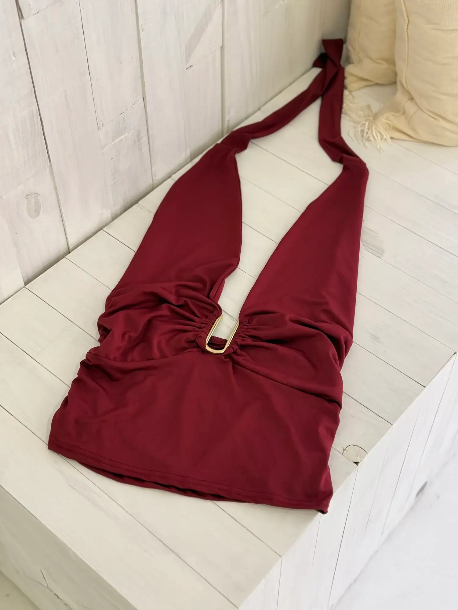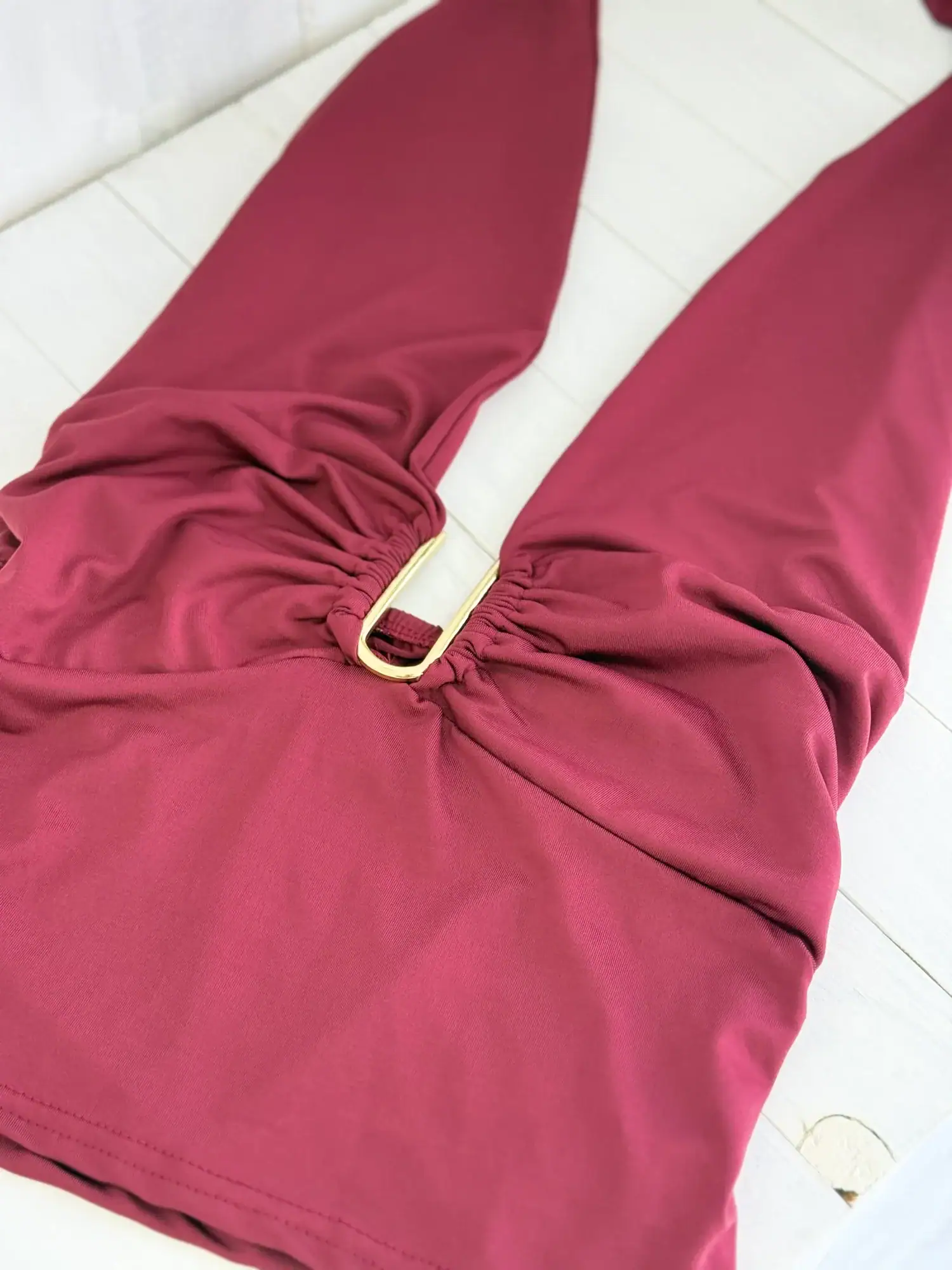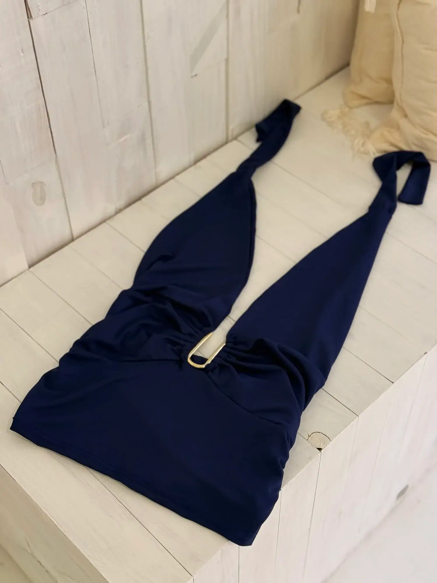 Possui drapeado na lateral, que valoriza a silhueta e cria um efeito elegante no corpo. O destaque especial fica por conta do detalhe metálico frontal, que adiciona charme e um toque refinado à peça.
