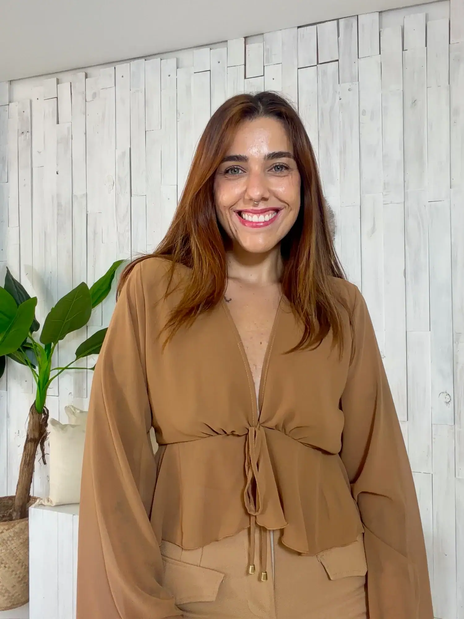 O modelo possui amarração frontal, que cria um efeito levemente drapeado abaixo do busto, deixando a peça ainda mais feminina e estilosa. As mangas longas em tule completam o visual com leveza e elegância.