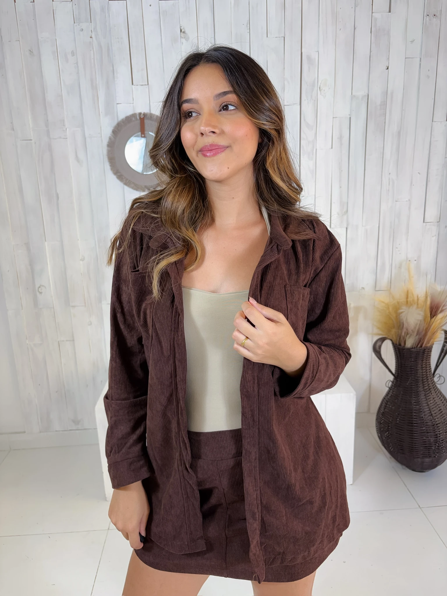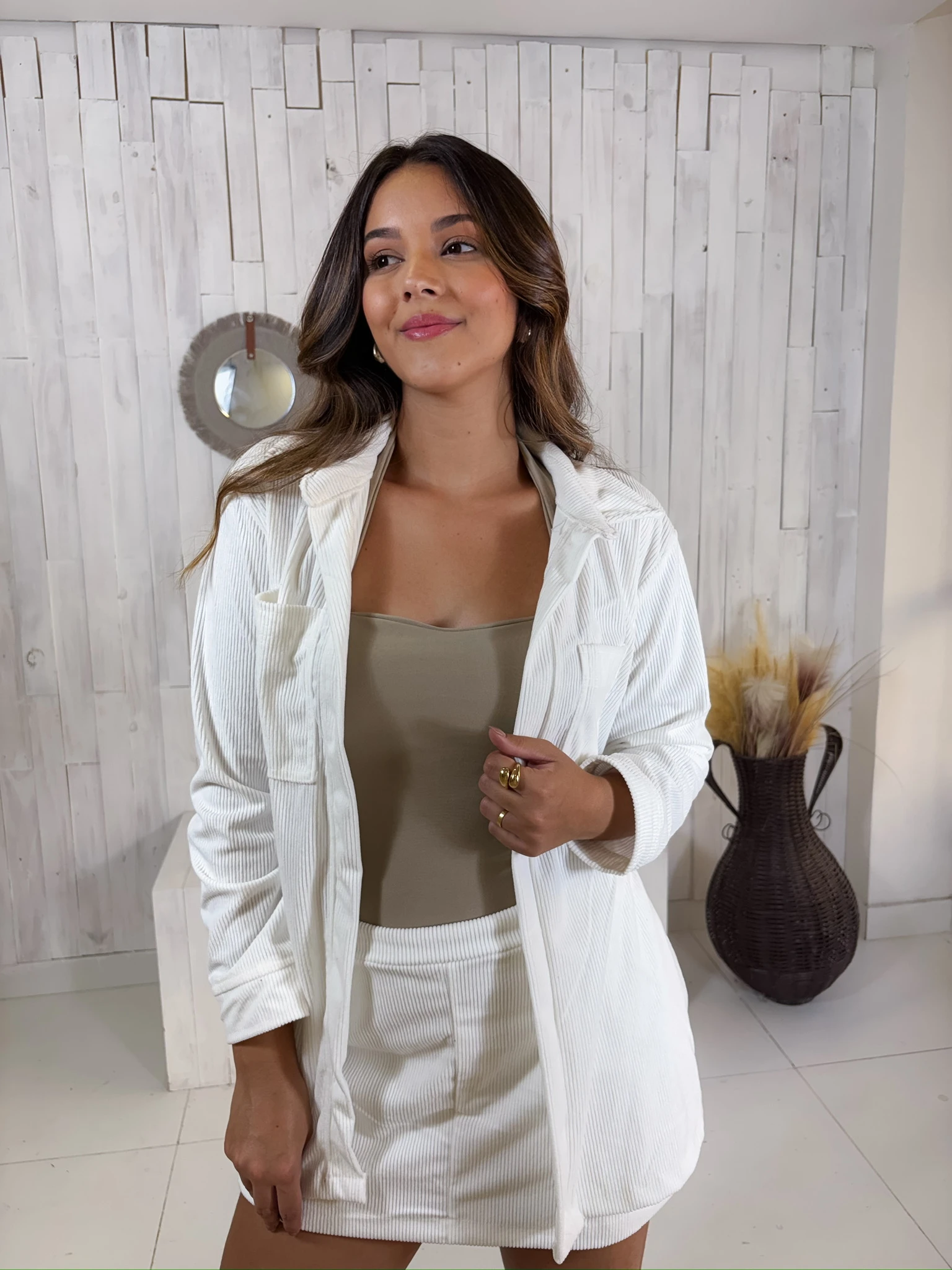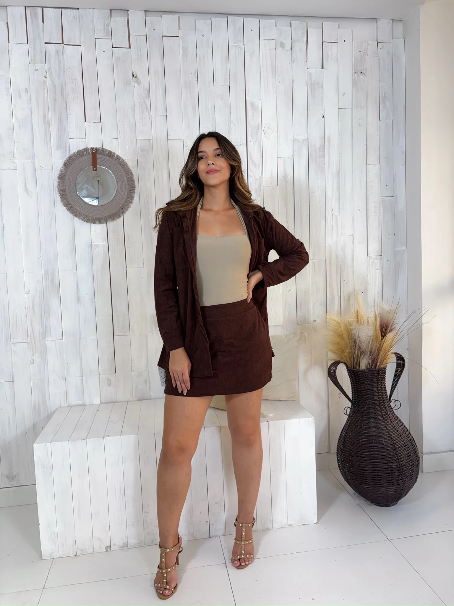 Conjunto em cotelê de camisa aberta + short-saia que é puro estilo e versatilidade 🤍✨