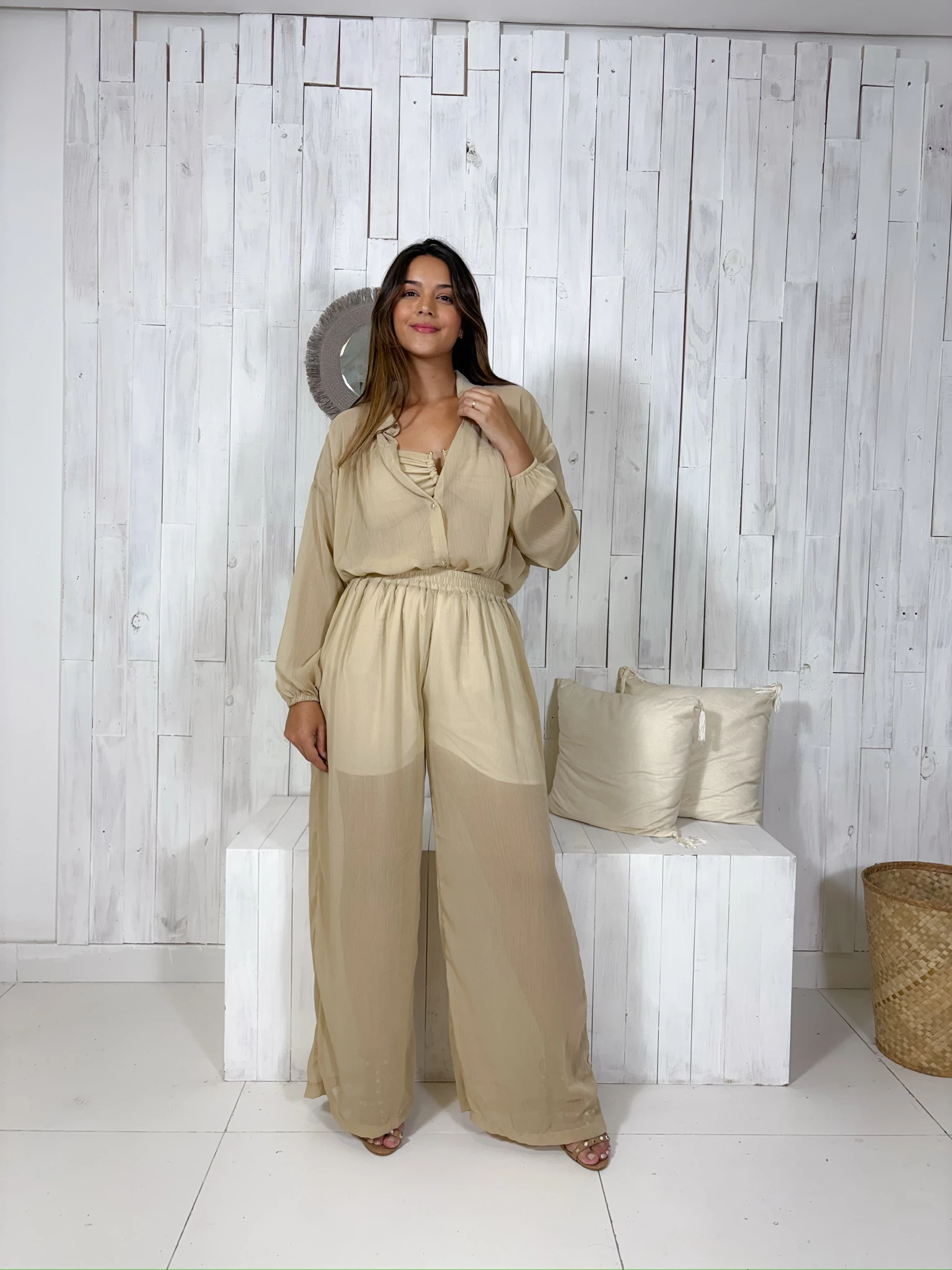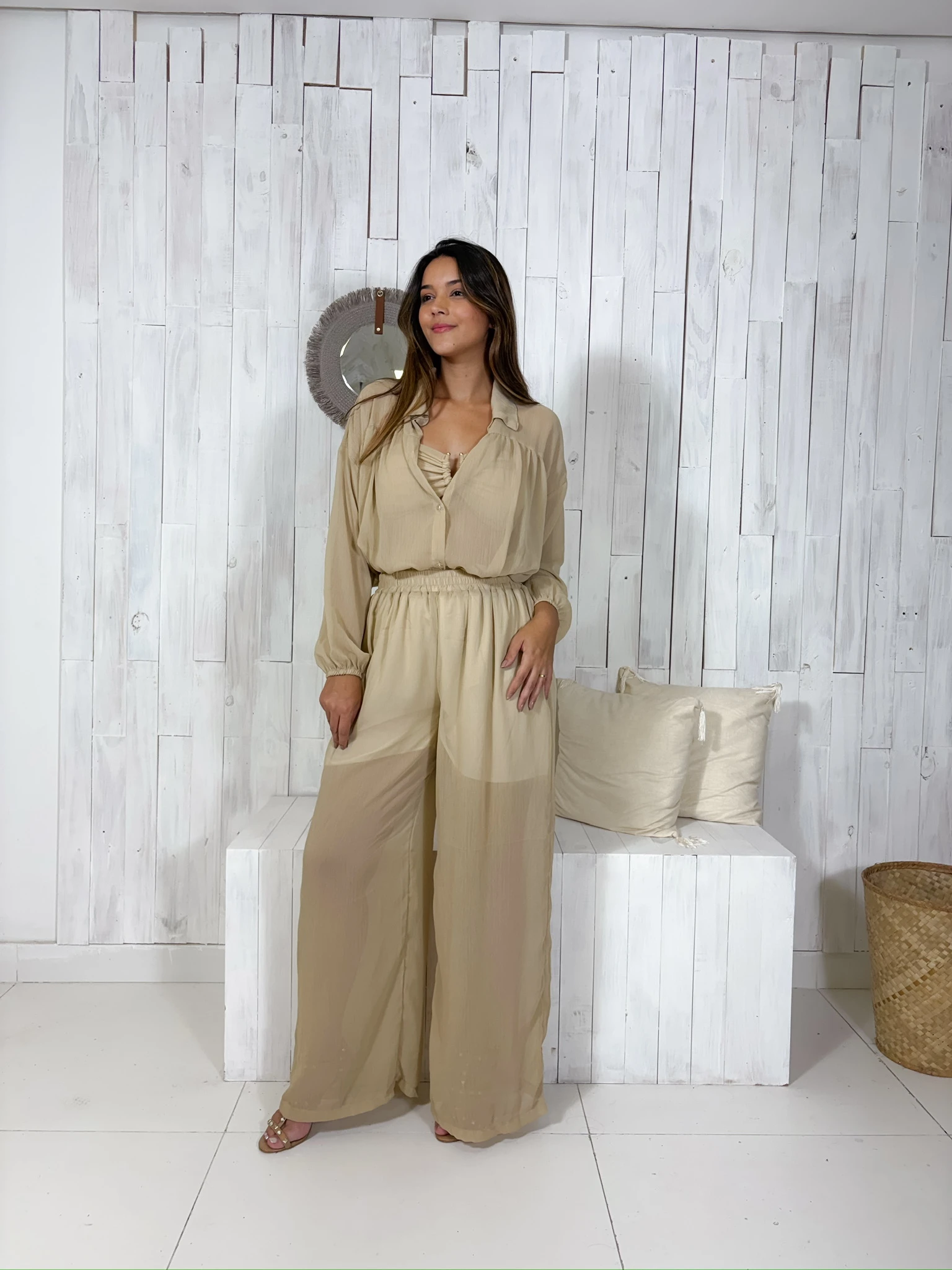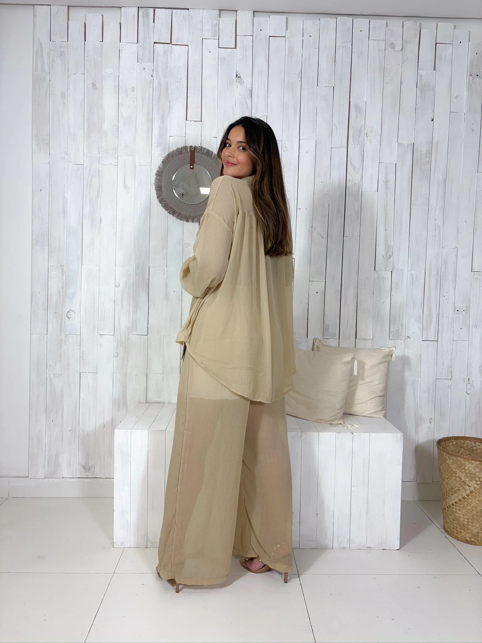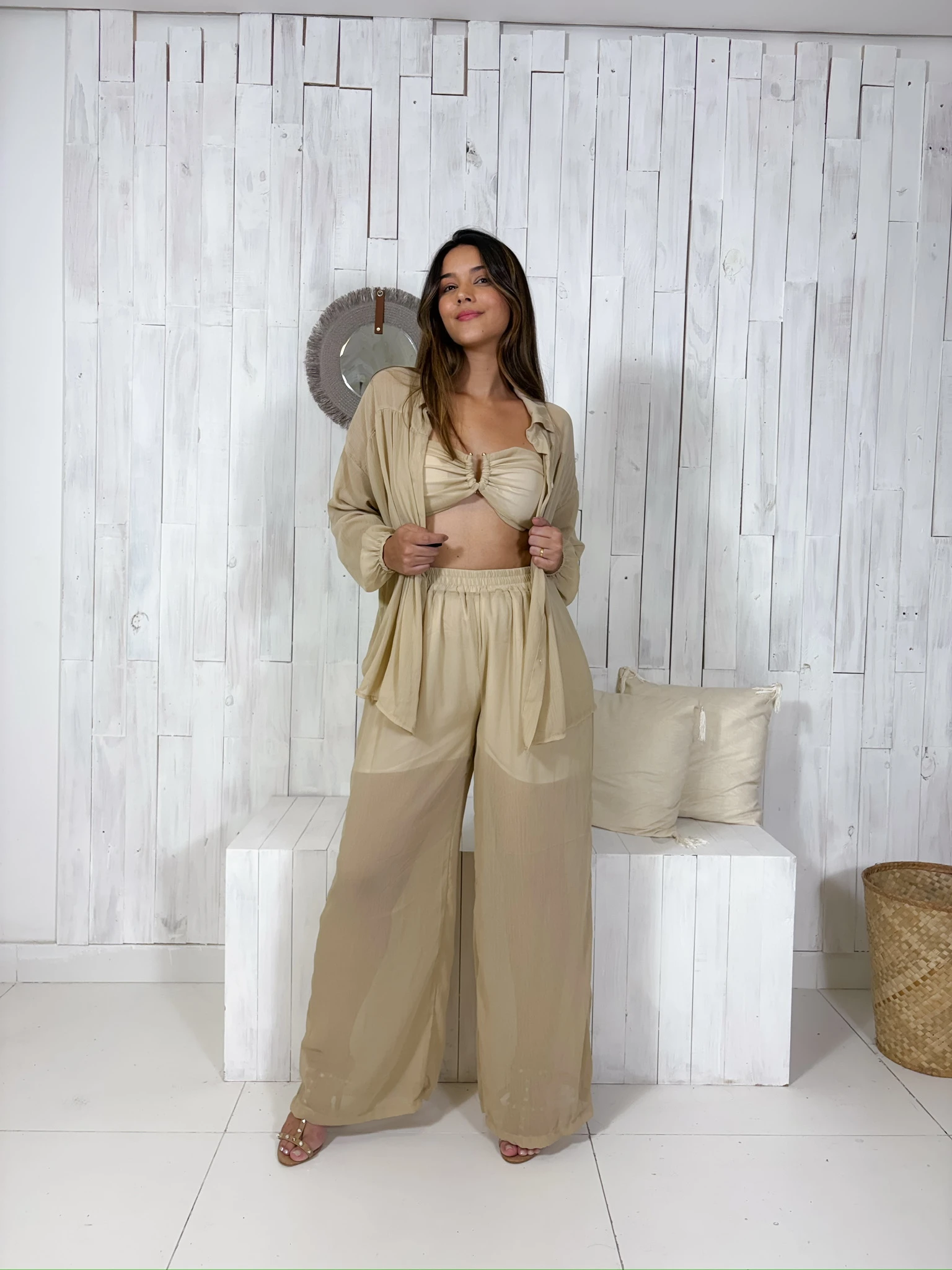 O cropped possui detalhe de pingente frontal, trazendo um toque delicado e moderno que valoriza ainda mais a peça. A chemise funciona como terceira peça, adicionando leveza e movimento, enquanto a pantalona garante um caimento fluido e alonga a silhueta. 💫