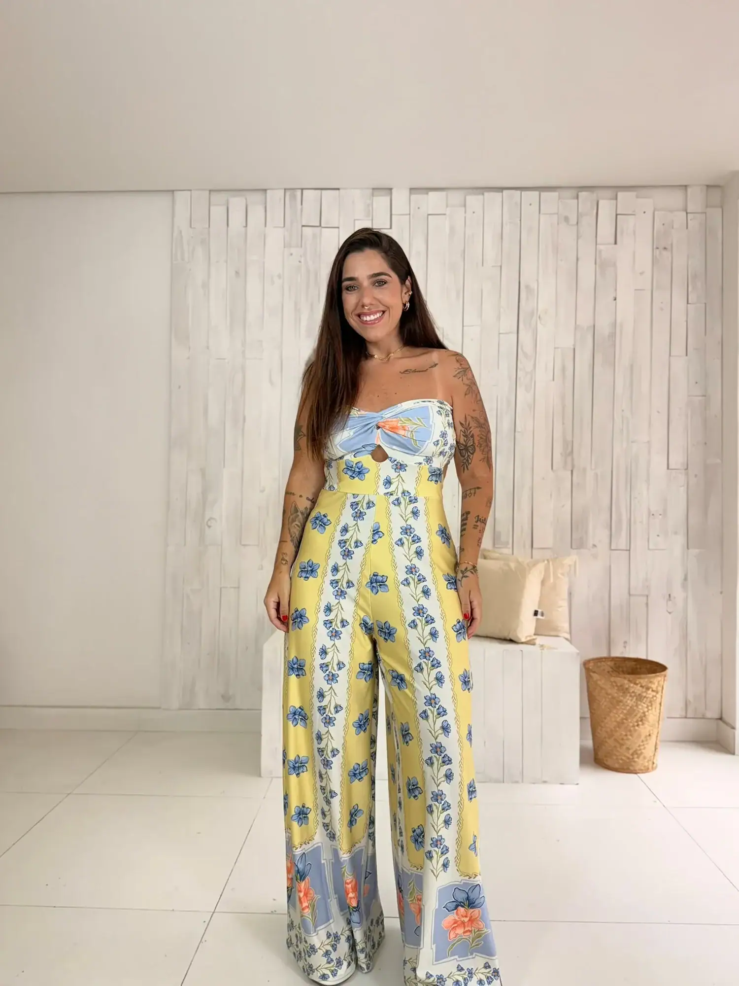 O modelo tomara que caia traz detalhe torcido no busto com recorte estratégico, deixando o visual moderno e feminino na medida certa. A estampa floral em tons de azul e amarelo transmite frescor e delicadeza, enquanto a modelagem pantalona garante movimento e sofisticação.