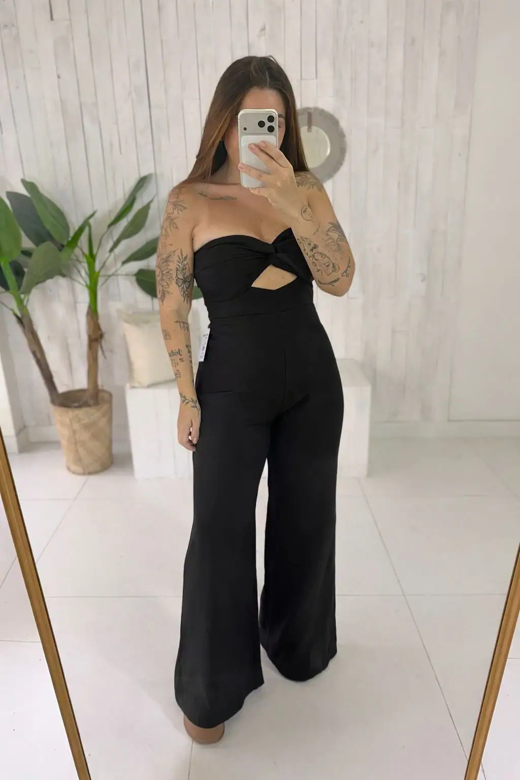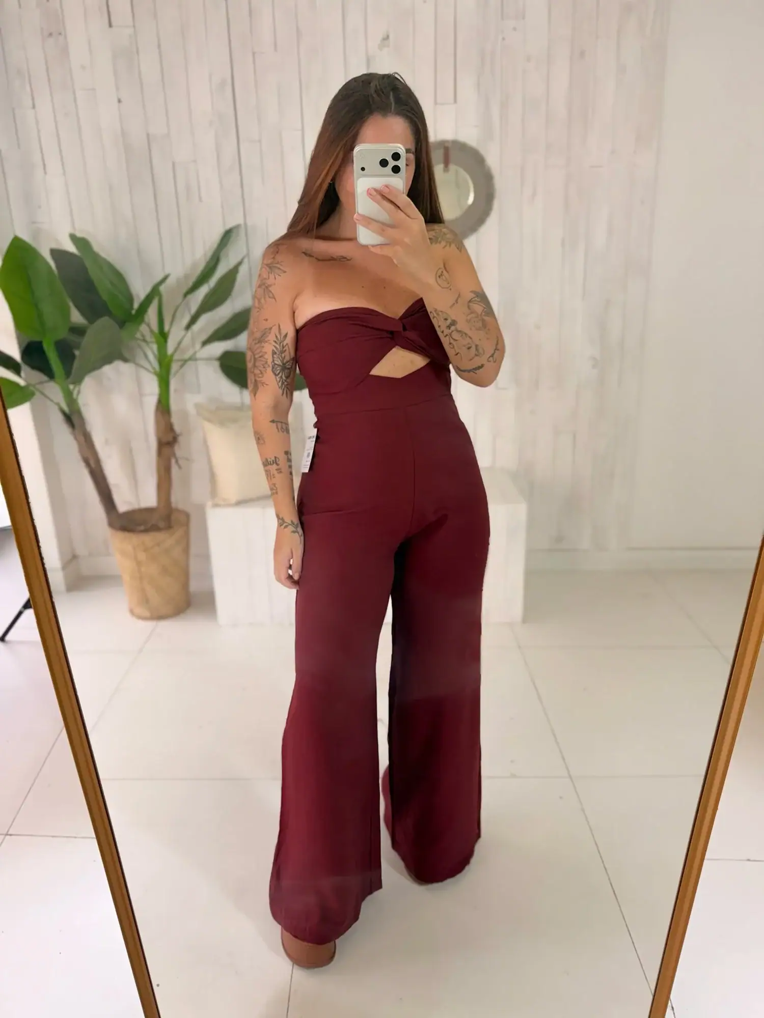 O modelo tomara que caia traz detalhe torcido no busto com recorte estratégico, deixando o visual moderno e feminino na medida certa.