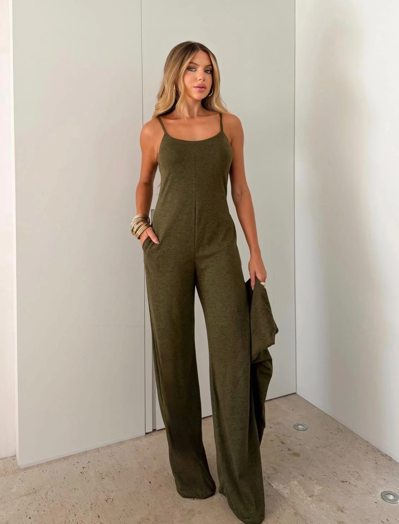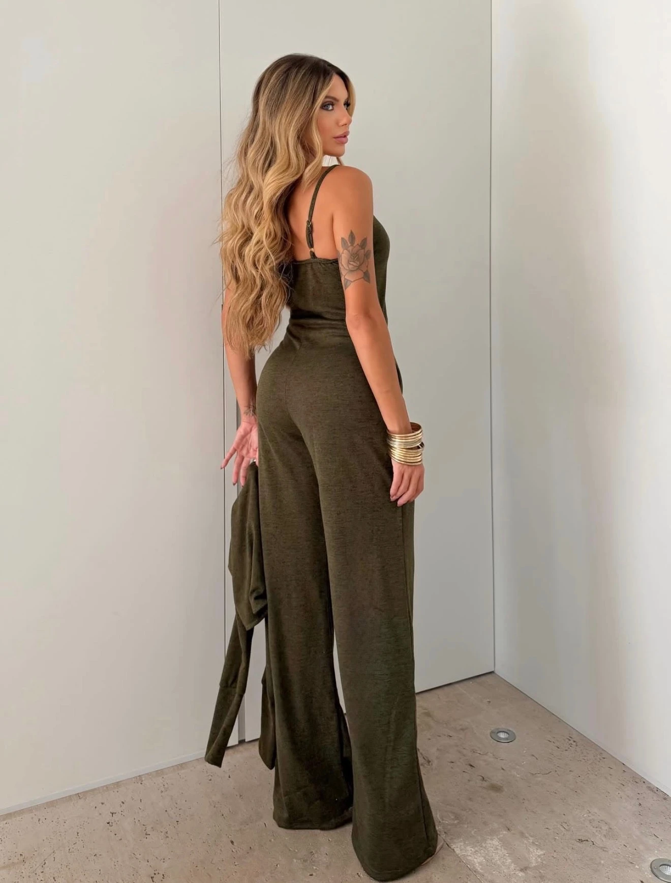 O conjunto é composto por macacão pantalona de alcinha com bolso + cropped de manga longa, formando uma produção moderna, versátil e super prática.