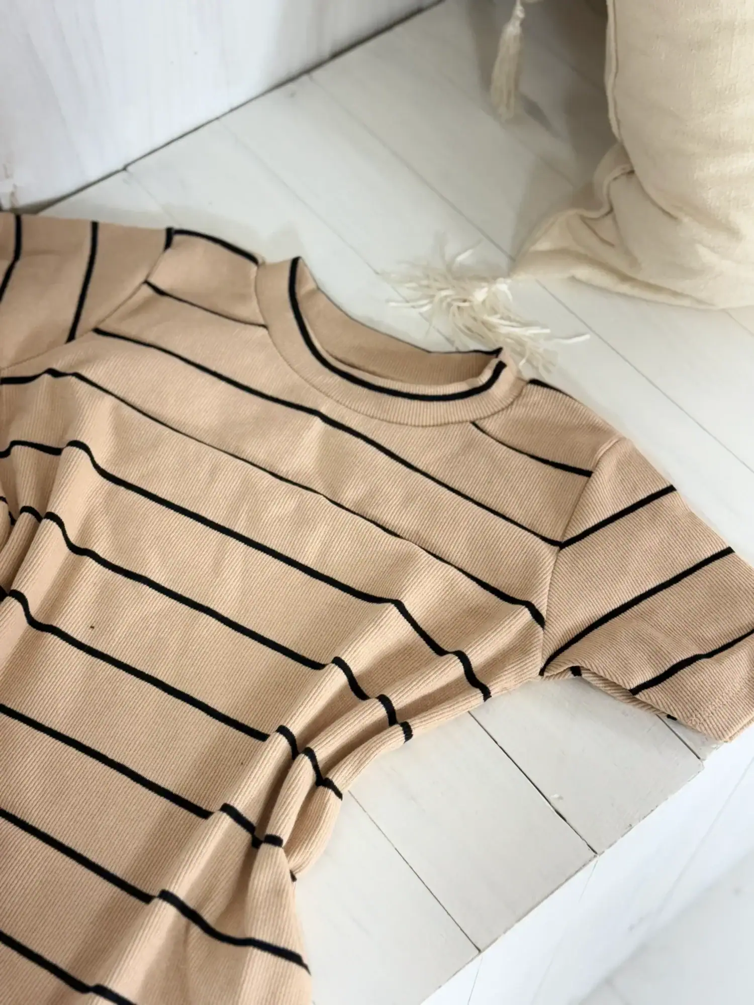 A T-shirt de ribana listrada é aquela peça versátil que combina facilmente com diversas produções. Confeccionada em ribana, possui elasticidade e um caimento que se ajusta ao corpo com muito conforto.